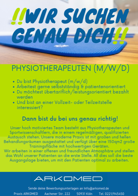 Zum nächstmöglichen Zeitpunkt suchen wir eine/n Physiotherapeut/in für 20-40 Std/Woche in der Praxis Arkomed Köln Lindenthal.